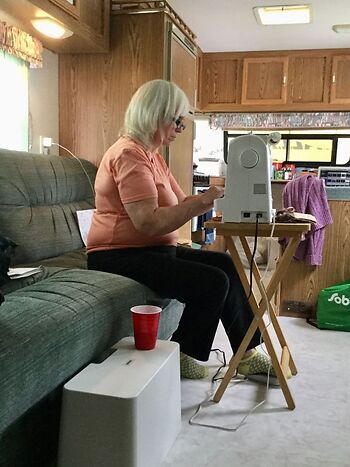 My mom is 91 so no one goes in her house, so no access to my sewing! With not much room in a trailer, my sweet hubby shifted a few things around, my daughter lent me her machine and I have my happy place.